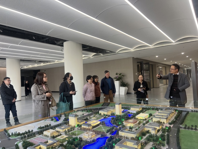 许烨芳一行参观了中福大楼展厅,了解研究院建设进展和阶段性成果,考察了大楼空间布局、基础设施及周边配套情况,并于702会议室座谈交流。随后,前往义乌市双江湖科教园区实地调研研究院规划院区地块。